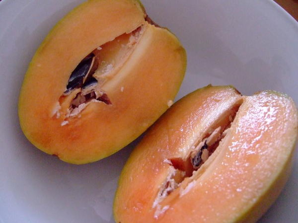 果実は薄い果皮の質感はジャガイモに似ており、直径4~8cmになります。果肉の外観は干し柿のような茶色、もしくは浅黄色です。石細胞を含んでおり、その食感は柿よりも柔らかくて、中に2~10個の種子が入っています。