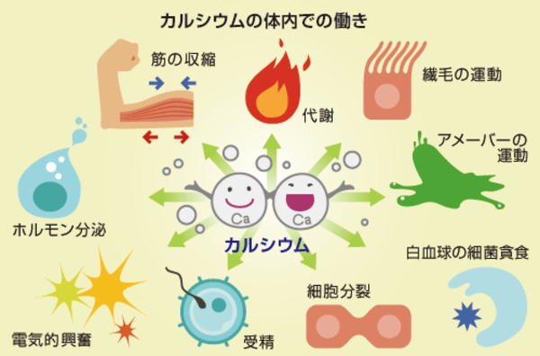 カルシウムは人体内で最も多いミネラルということで、体重の1~2%を占めています。そのほとんどが骨や歯に存在しています。僅かな残りは血液などの体液や筋肉、細胞に分布して、体の機能をいろいろ調整しています。